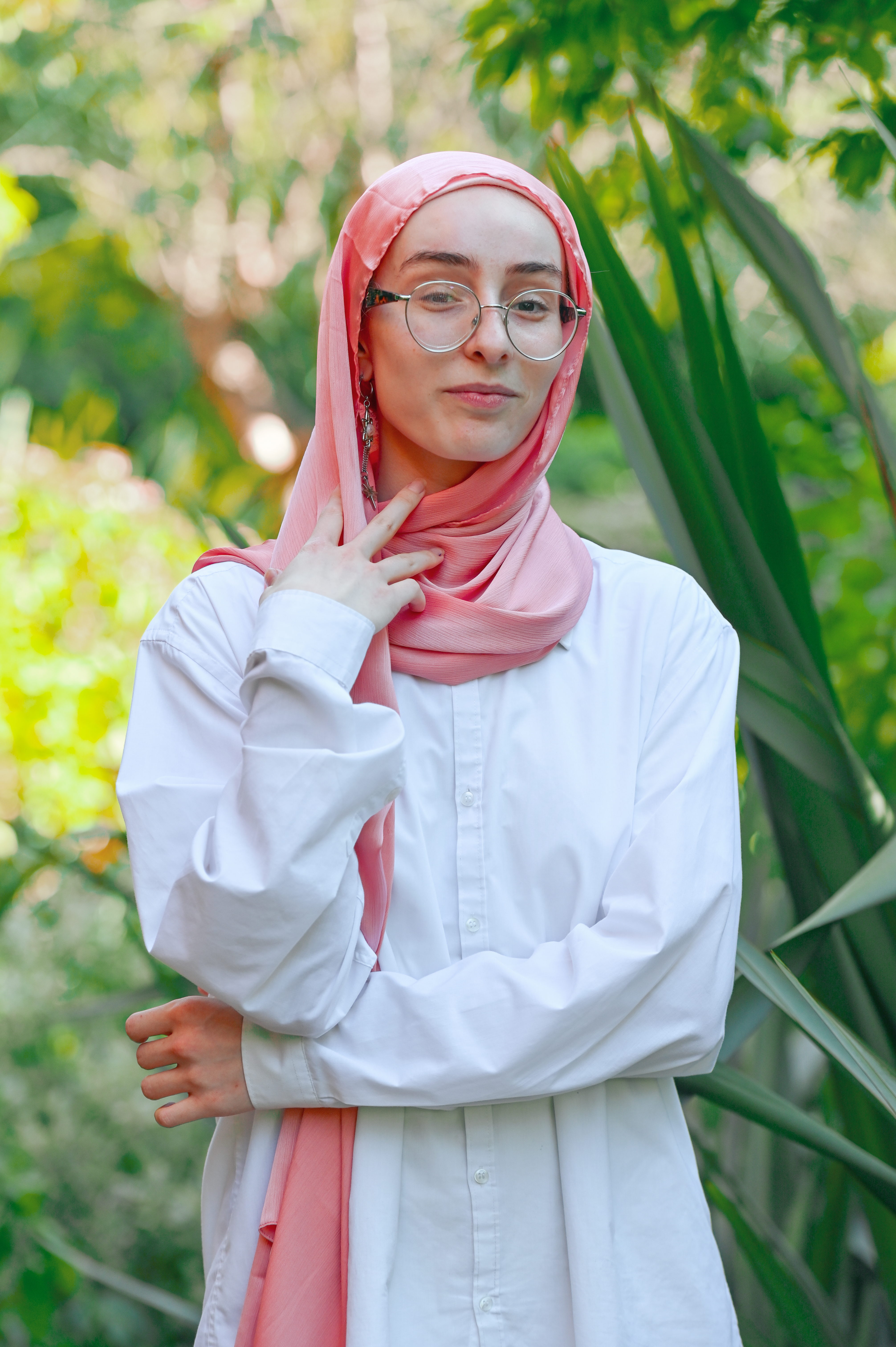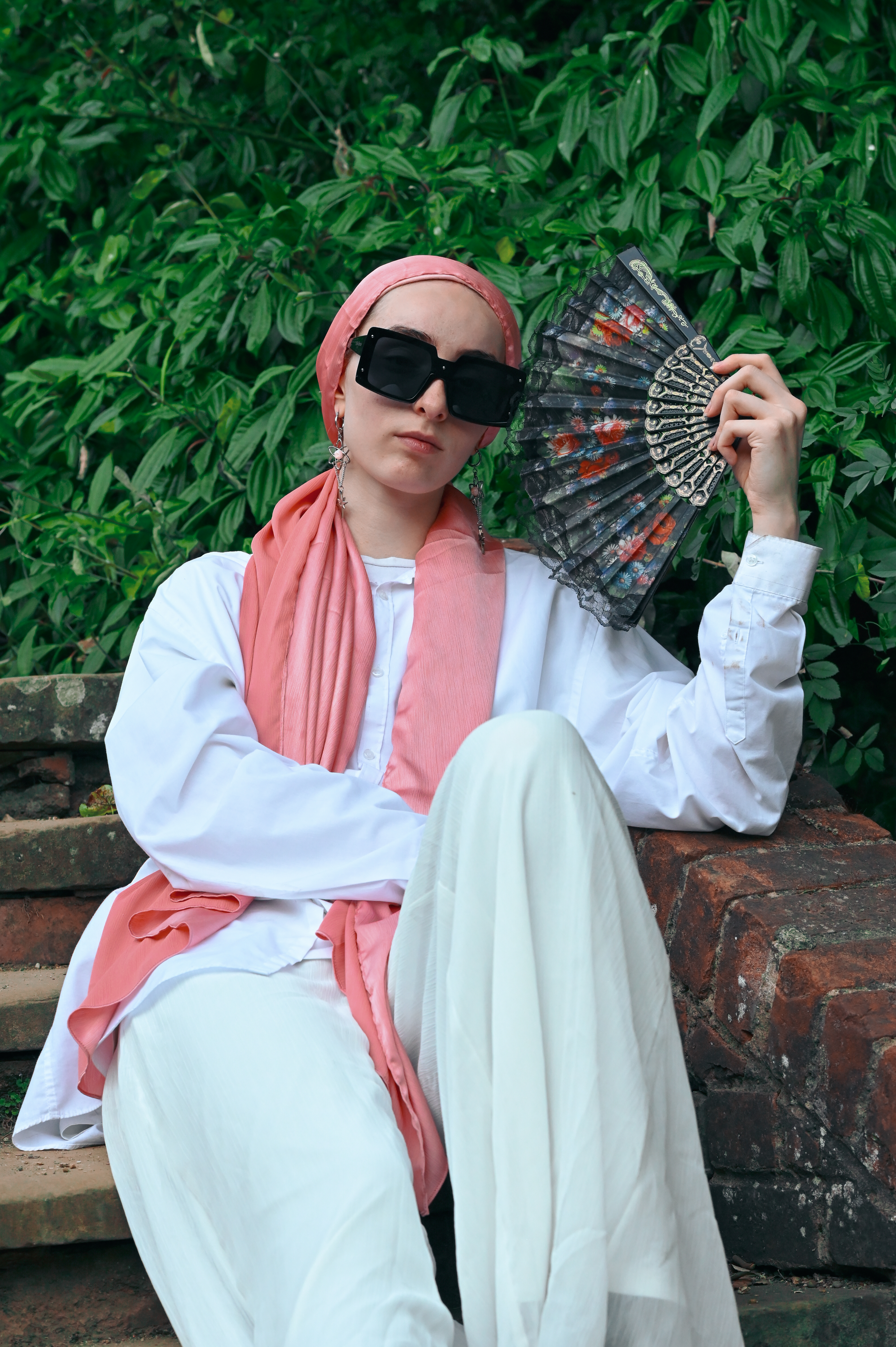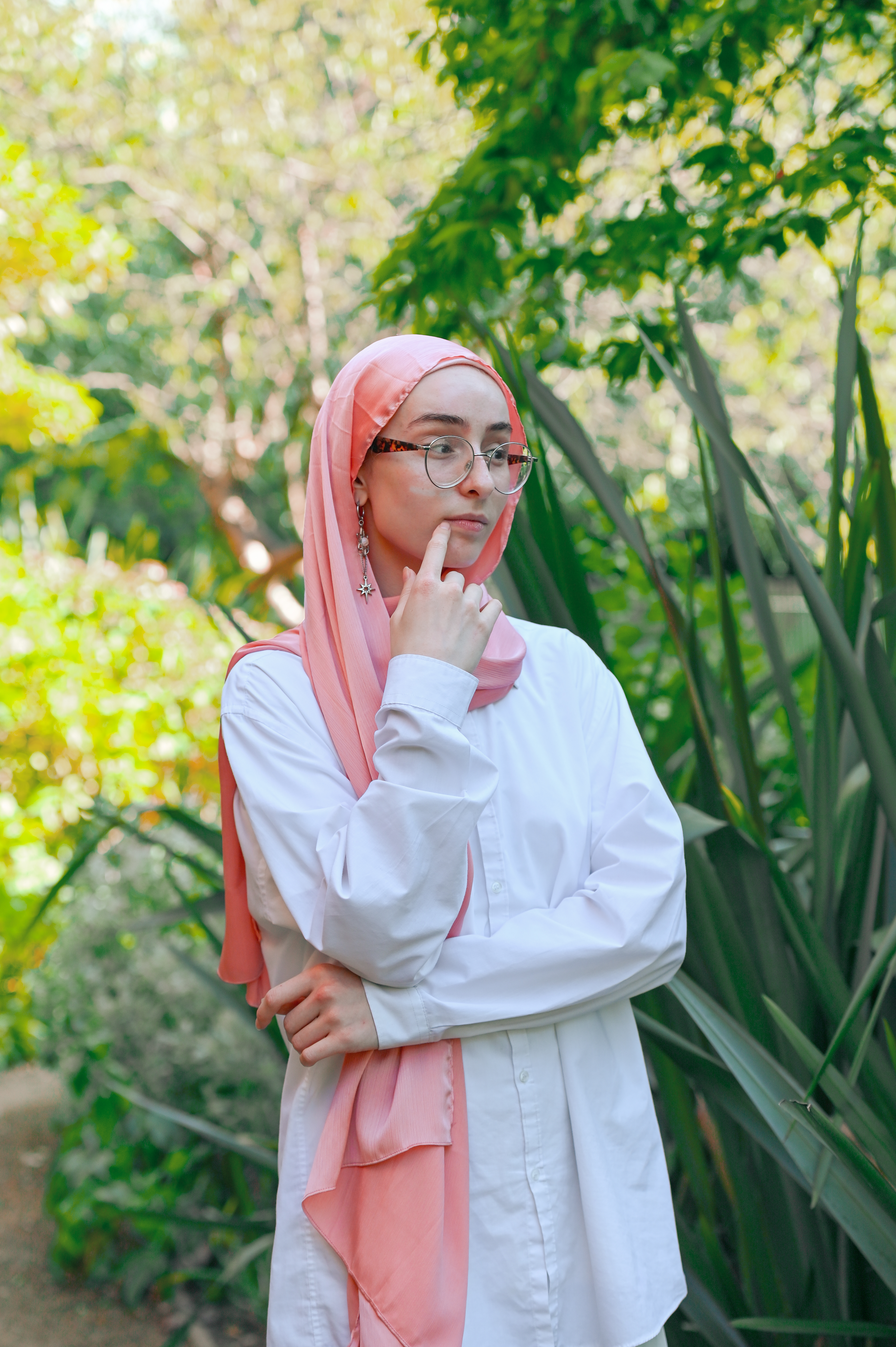 As instructed, Moon wore a white outfit with brown trousers with silky pink headscarf. A lot of the colour in the photos would be illustrated by the vibrant green backdrop which would be complimented by the sweet pinkish hue of Moon’s headscarf. Her white clothes were intended to add a sense of balance to the final photos as they were of a neutral colour in this instance. Lighting on this day was somewhat harsh and we initially looked to avoid casting sharp shadows by selecting favourable spots at our chosen location (we did however deviate ever so slightly as they shoot progressed – more on this later). Samples can be seen below: