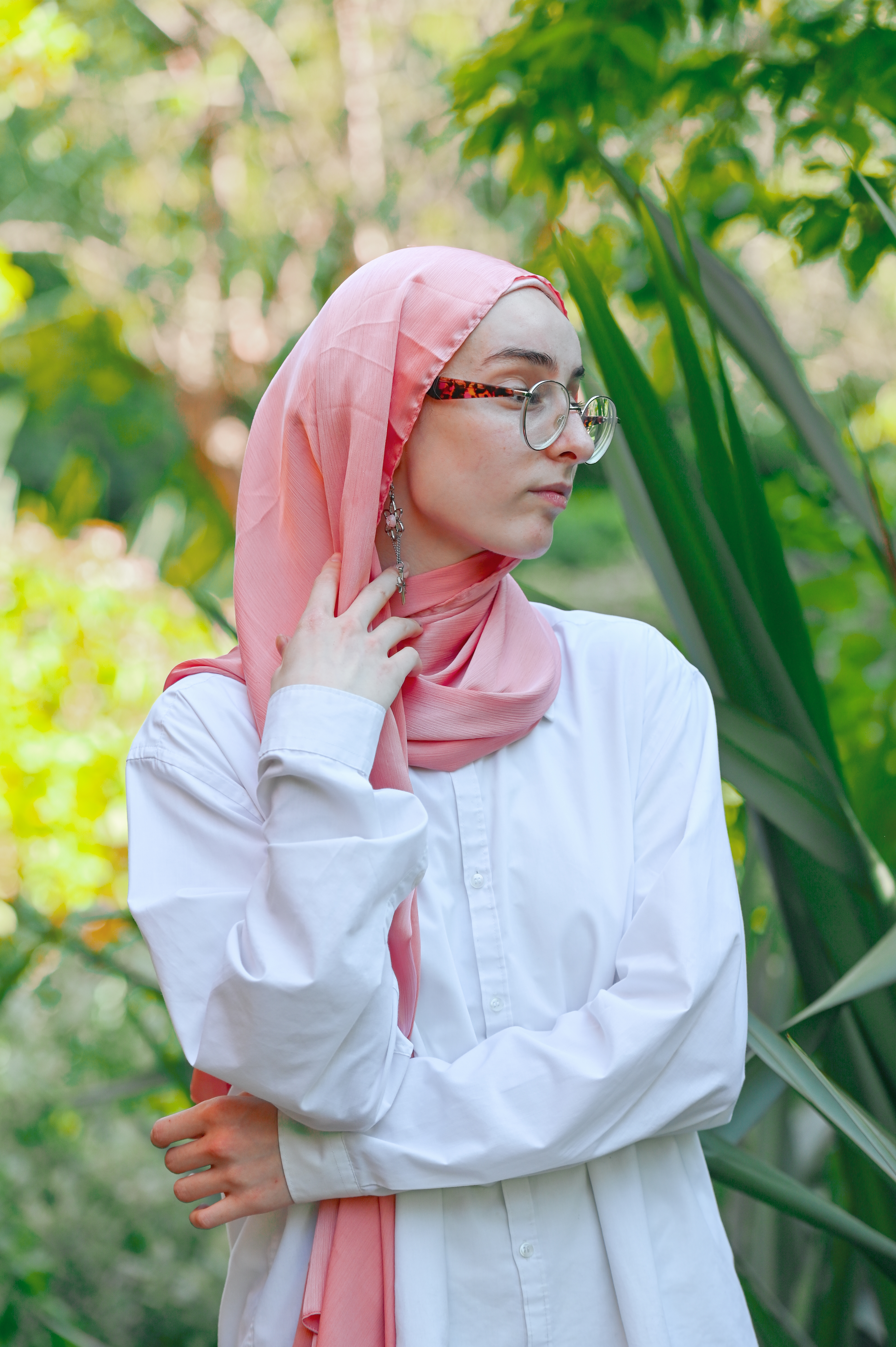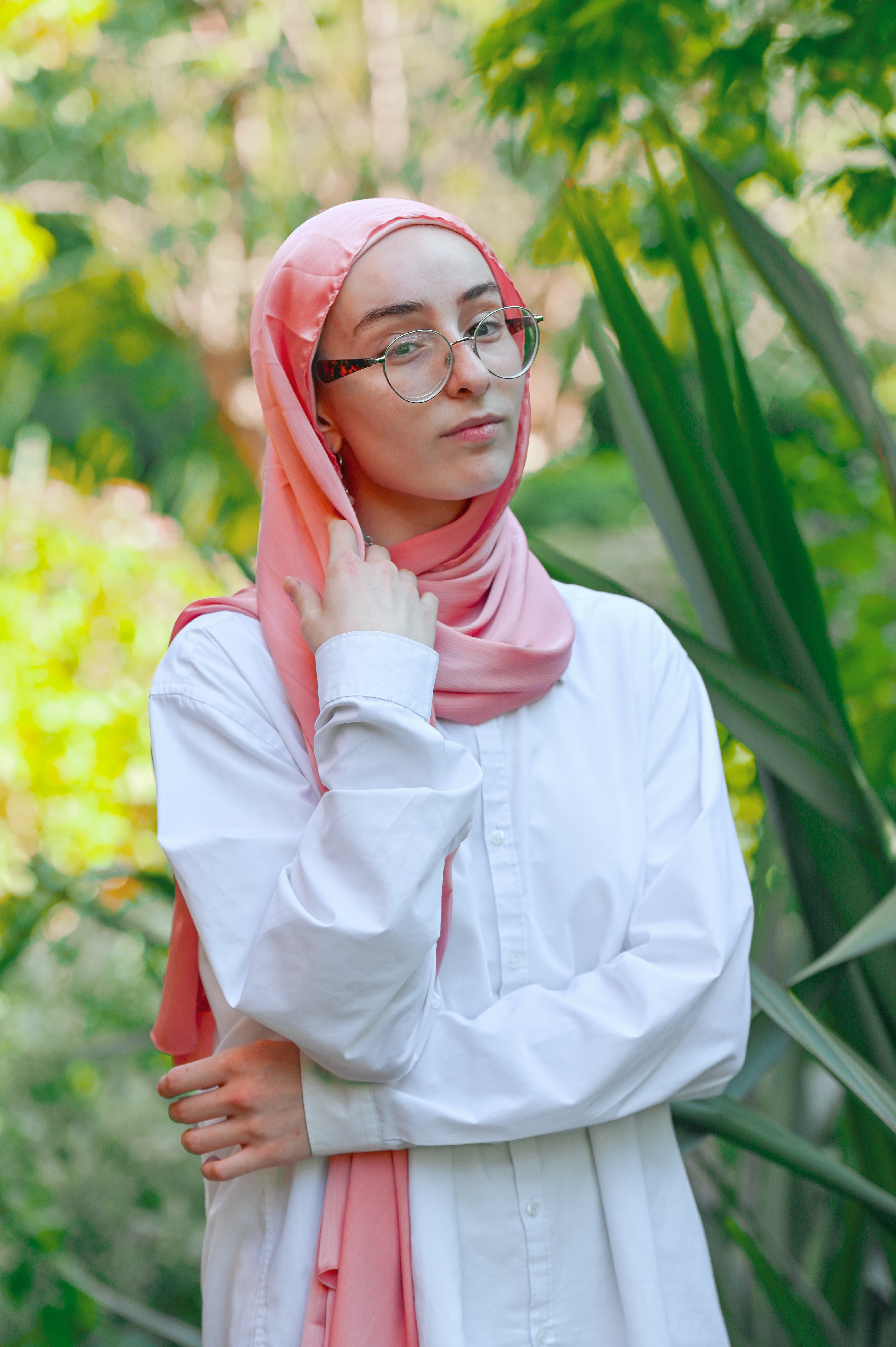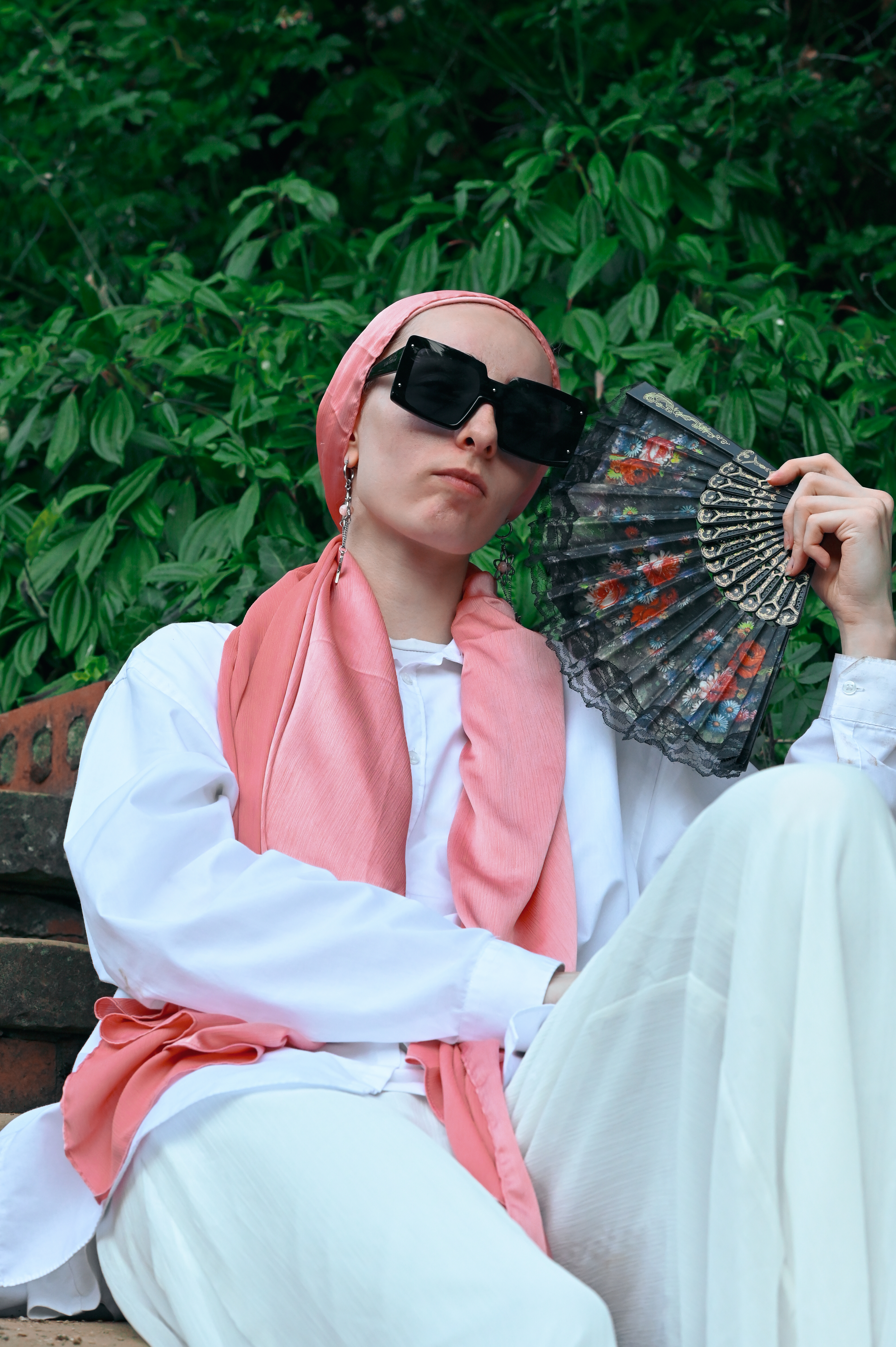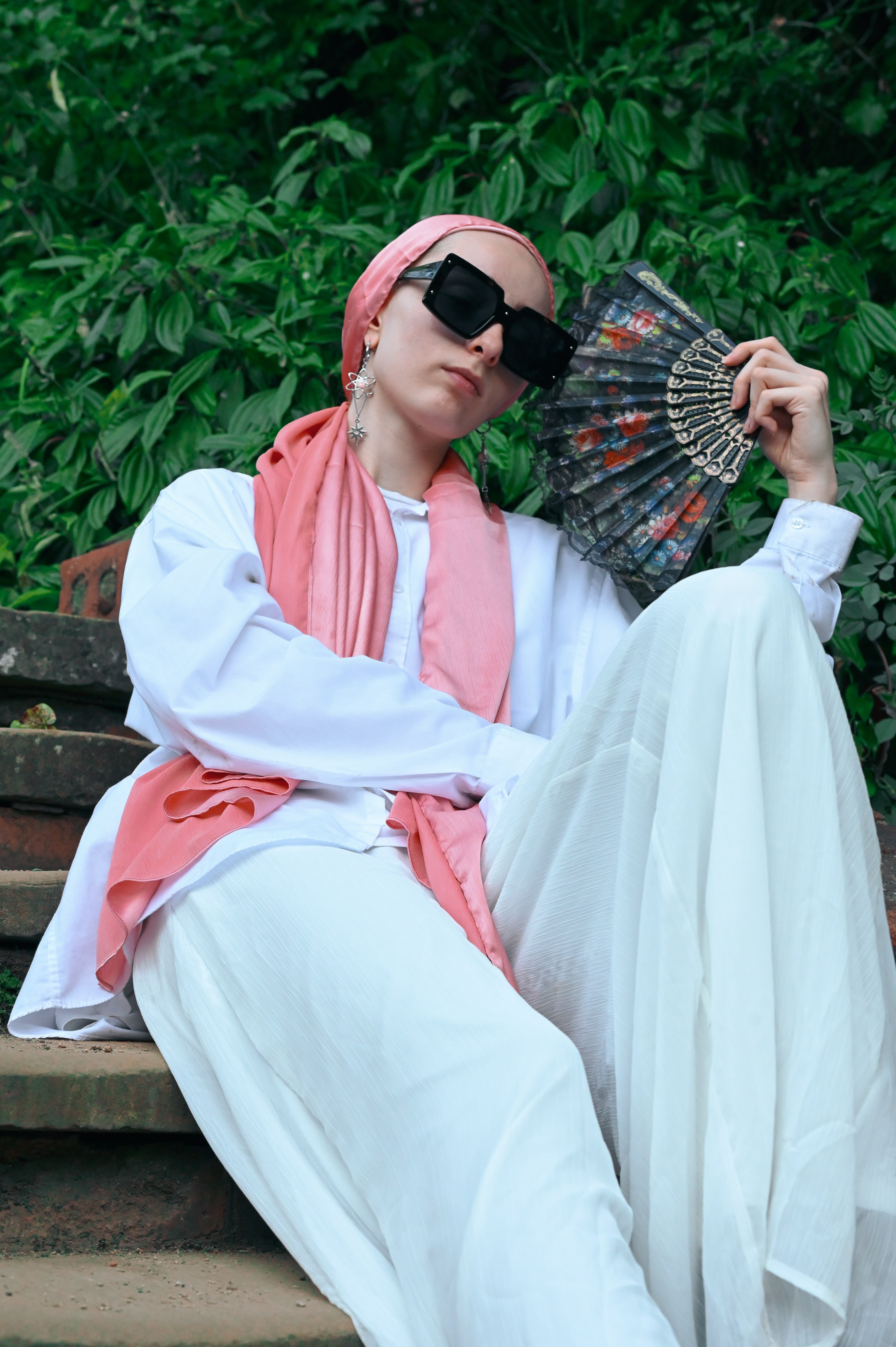 As instructed, Moon wore a white outfit with brown trousers with silky pink headscarf. A lot of the colour in the photos would be illustrated by the vibrant green backdrop which would be complimented by the sweet pinkish hue of Moon’s headscarf. Her white clothes were intended to add a sense of balance to the final photos as they were of a neutral colour in this instance. Lighting on this day was somewhat harsh and we initially looked to avoid casting sharp shadows by selecting favourable spots at our chosen location (we did however deviate ever so slightly as they shoot progressed – more on this later). Samples can be seen below: