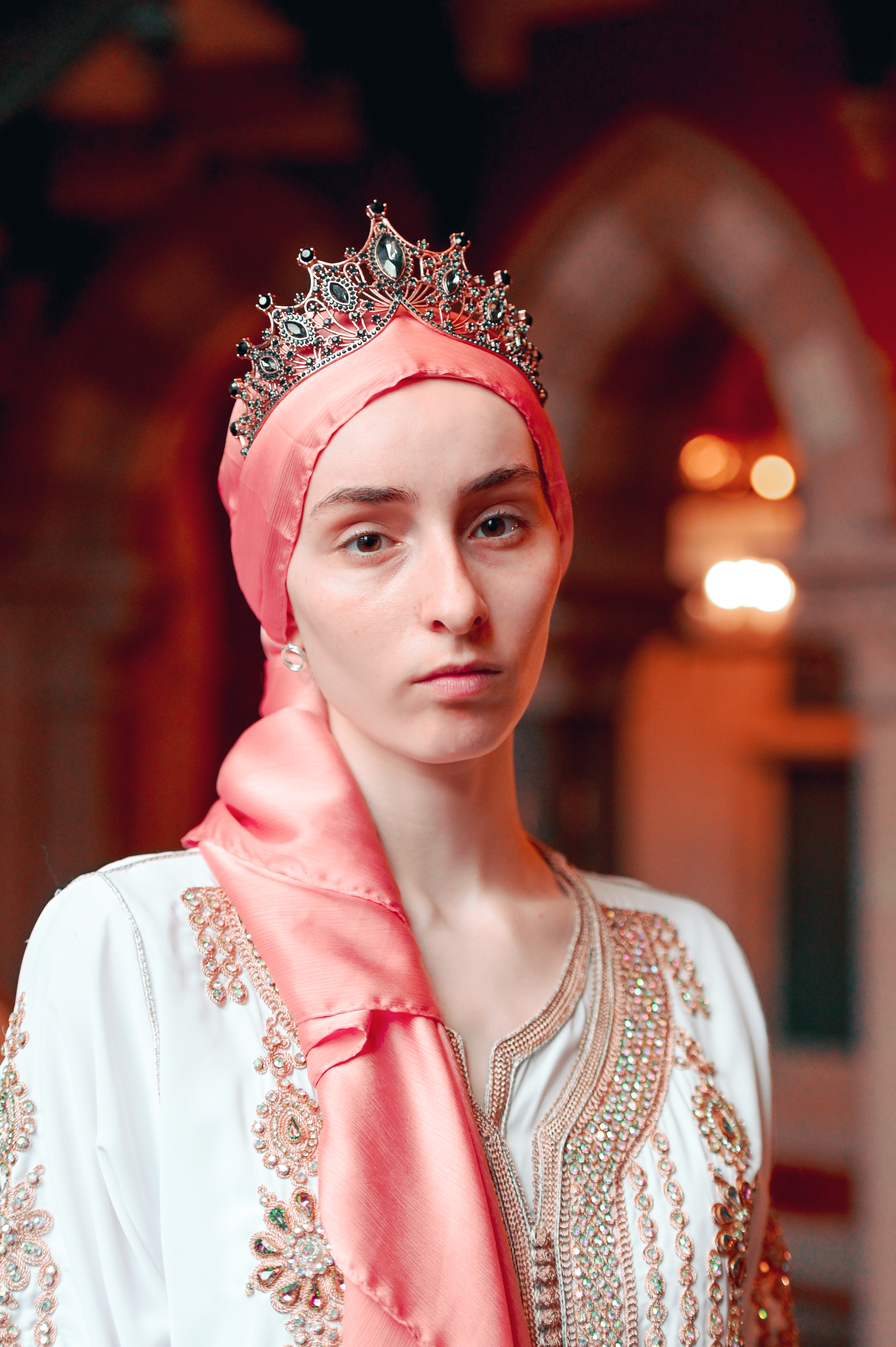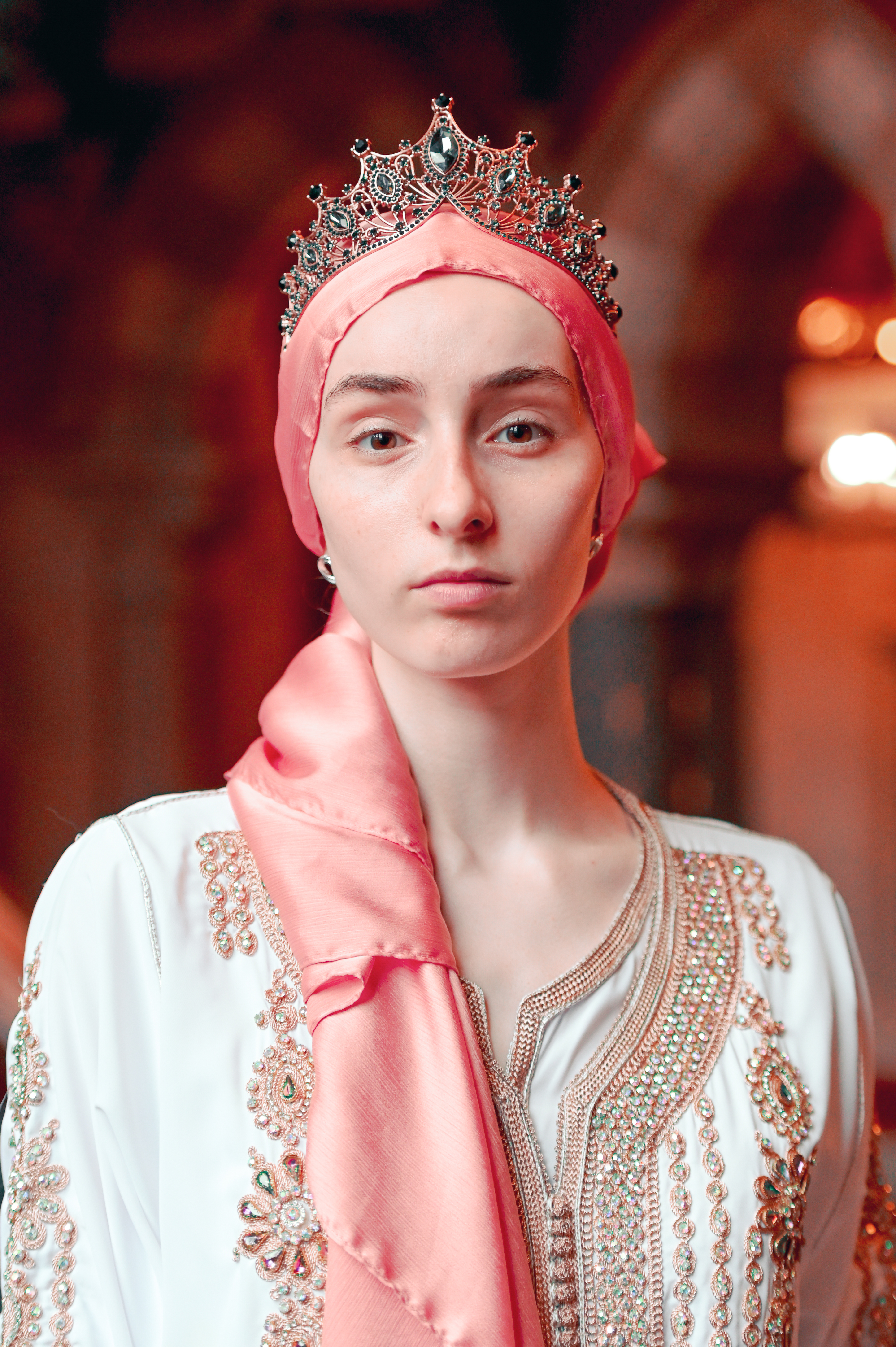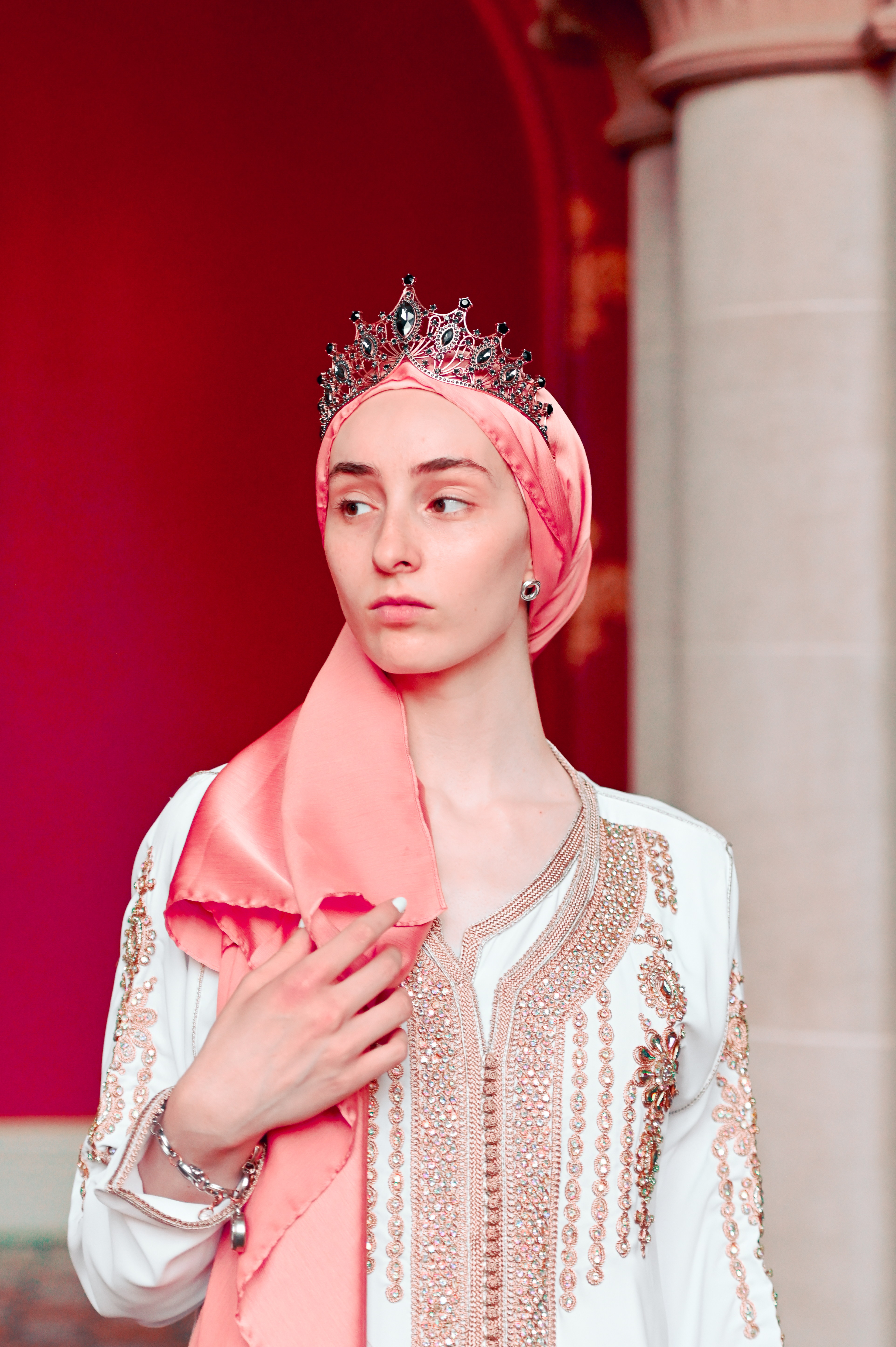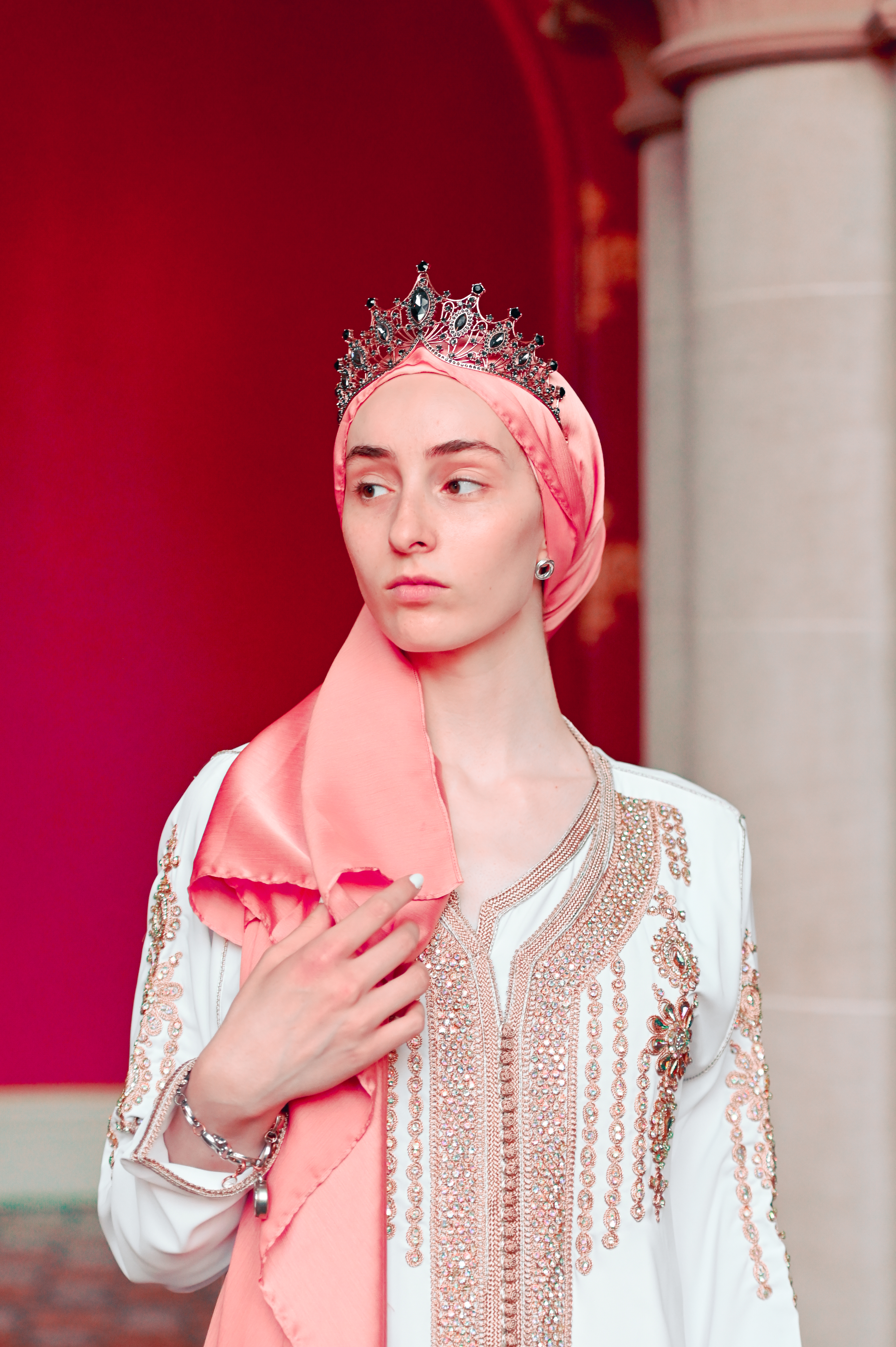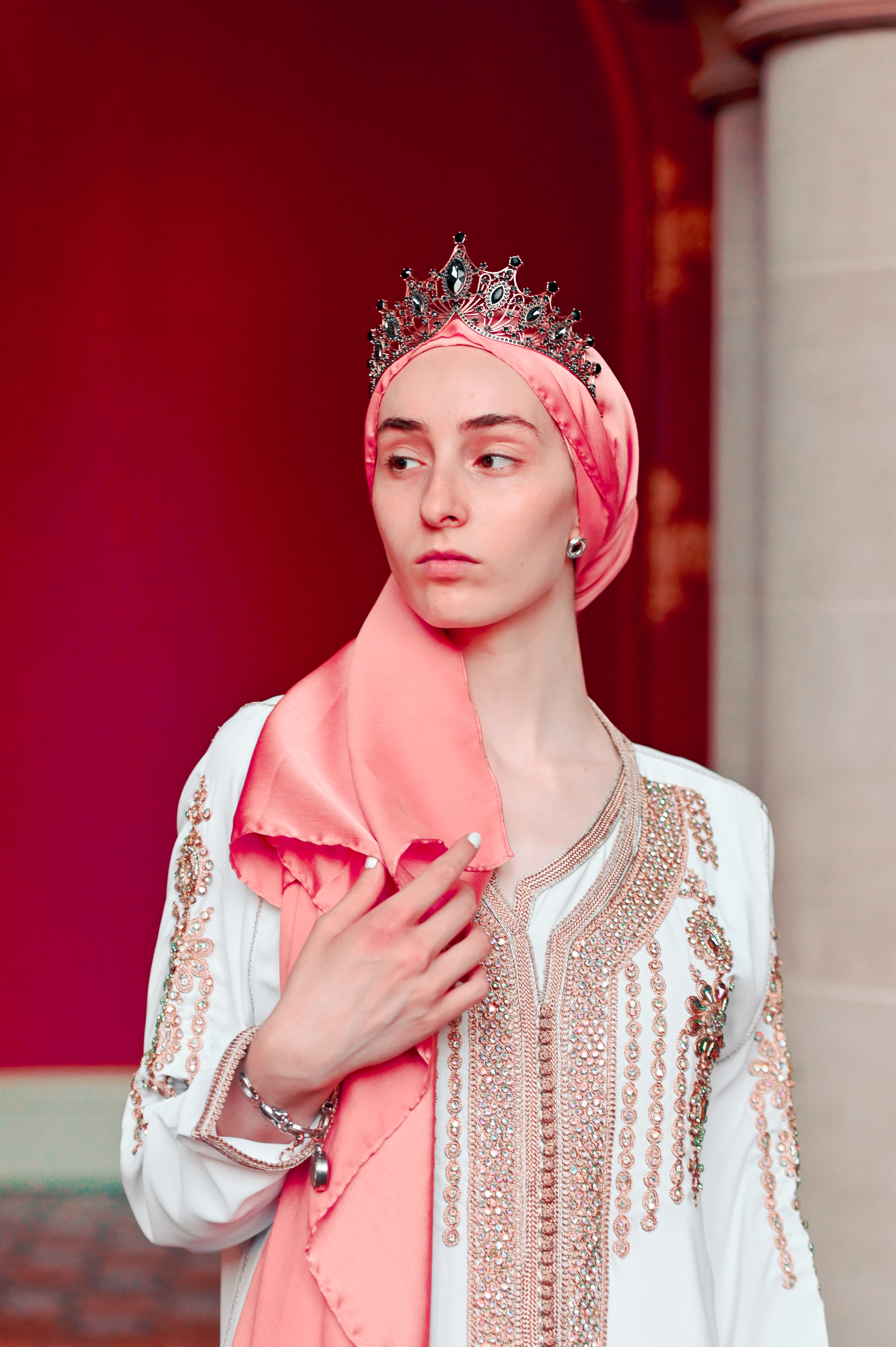 As the outfit was a bridal one, we wished to again utilise the white in the photos as a neutral colour whilst the pink hijab added a smidgen of femininity against the regal backdrop of the location. And of course, additionally, Moon’s tiara reinforced the photos emphasis towards a more royal look.