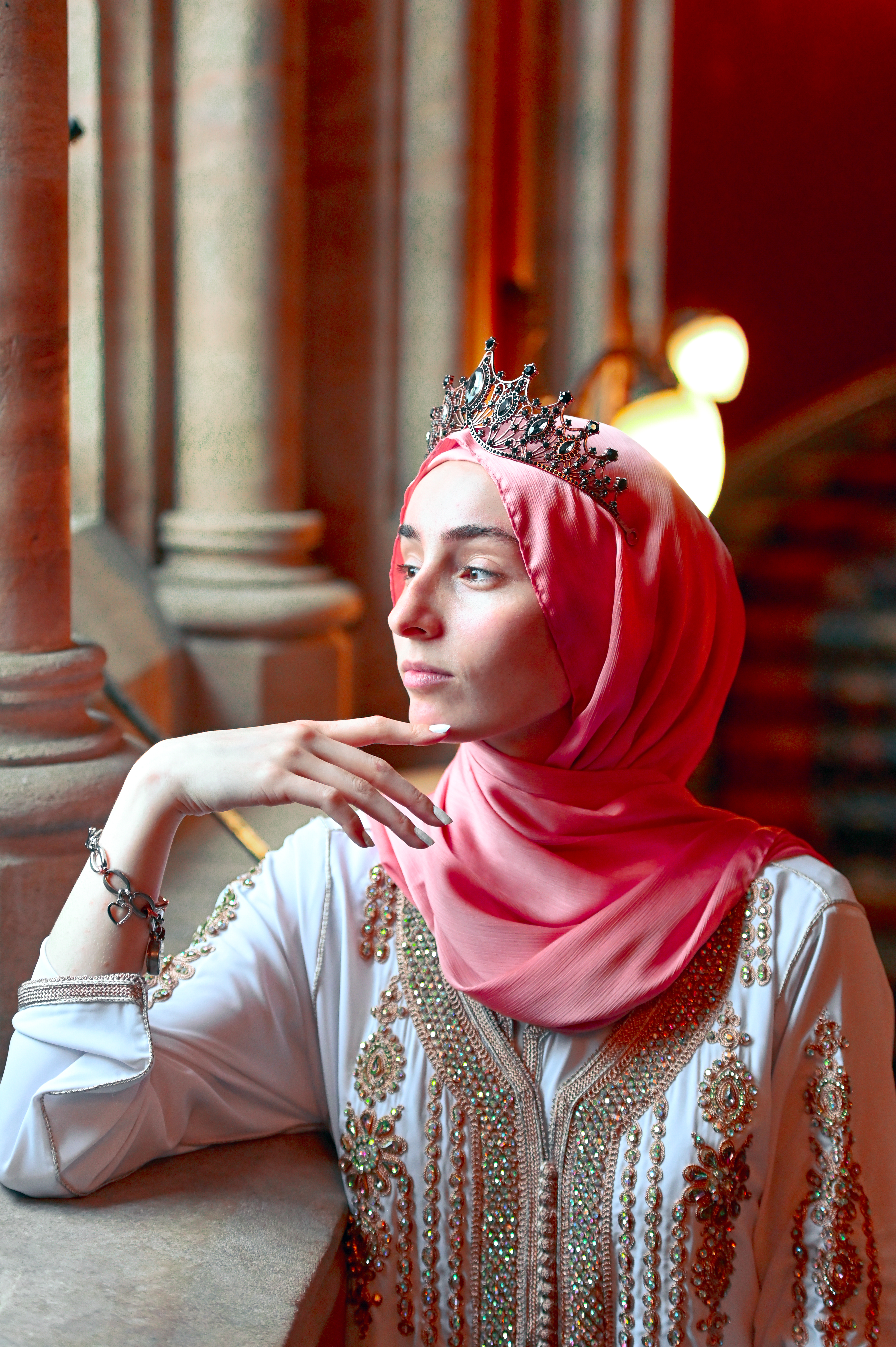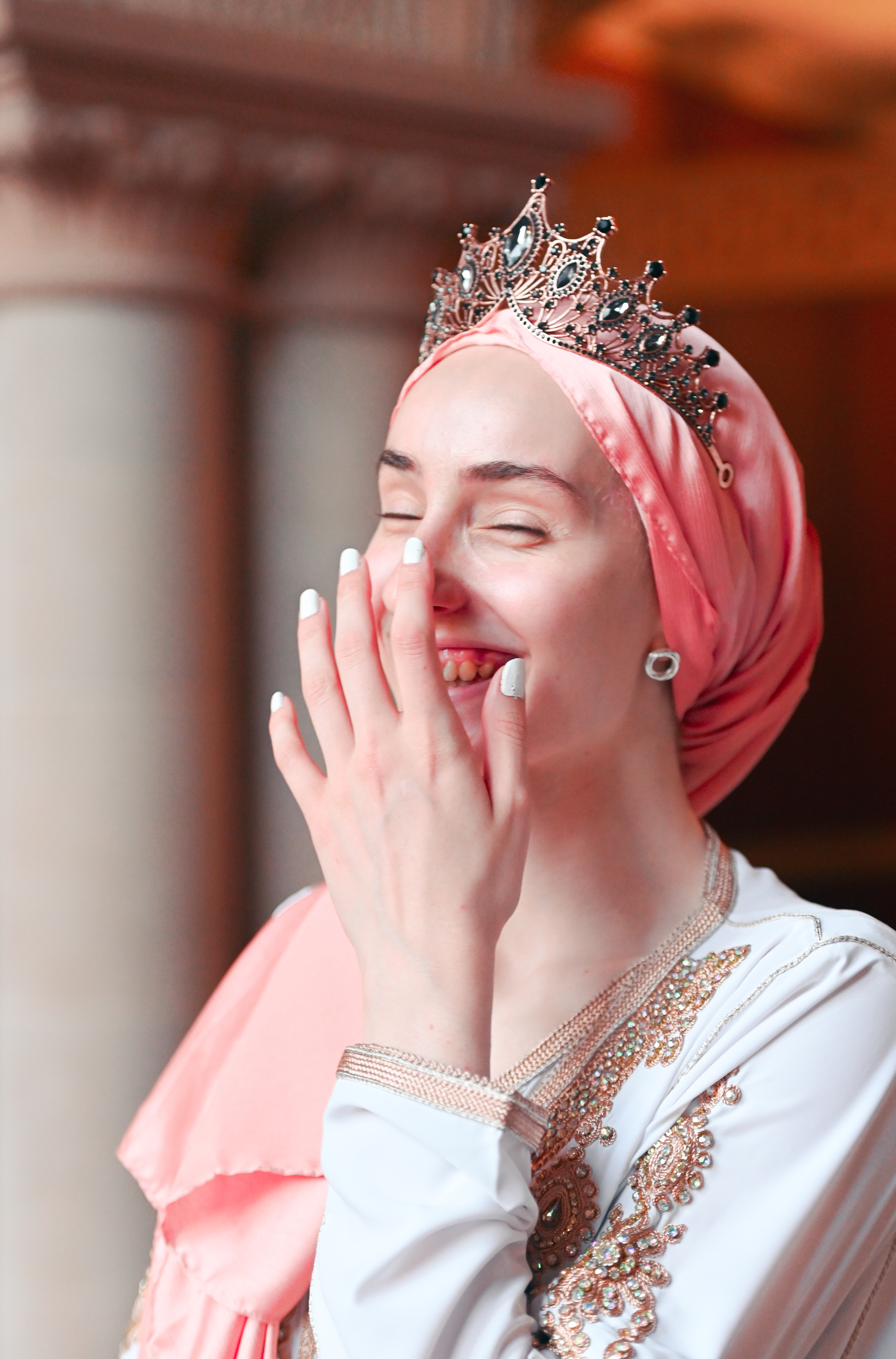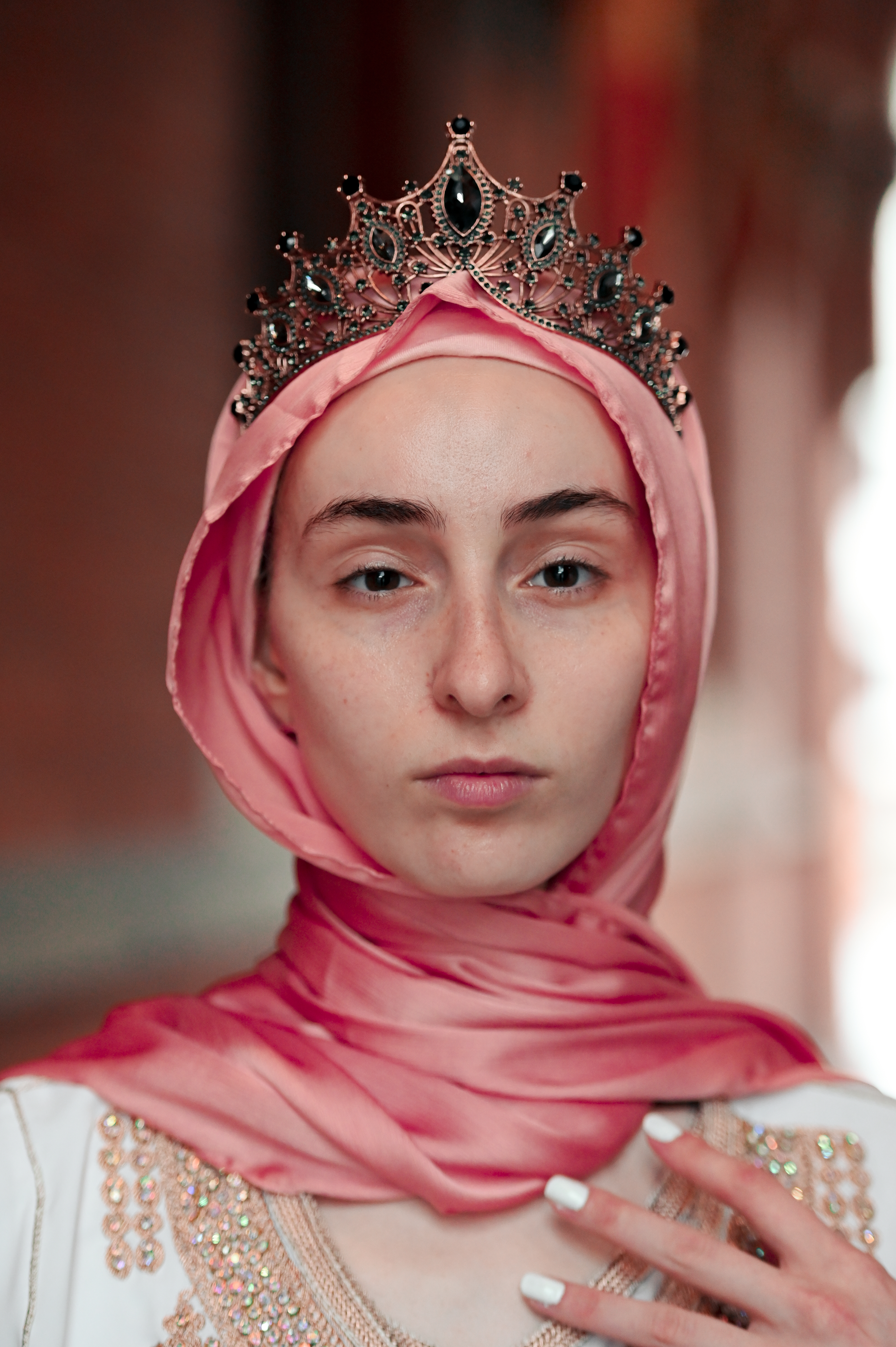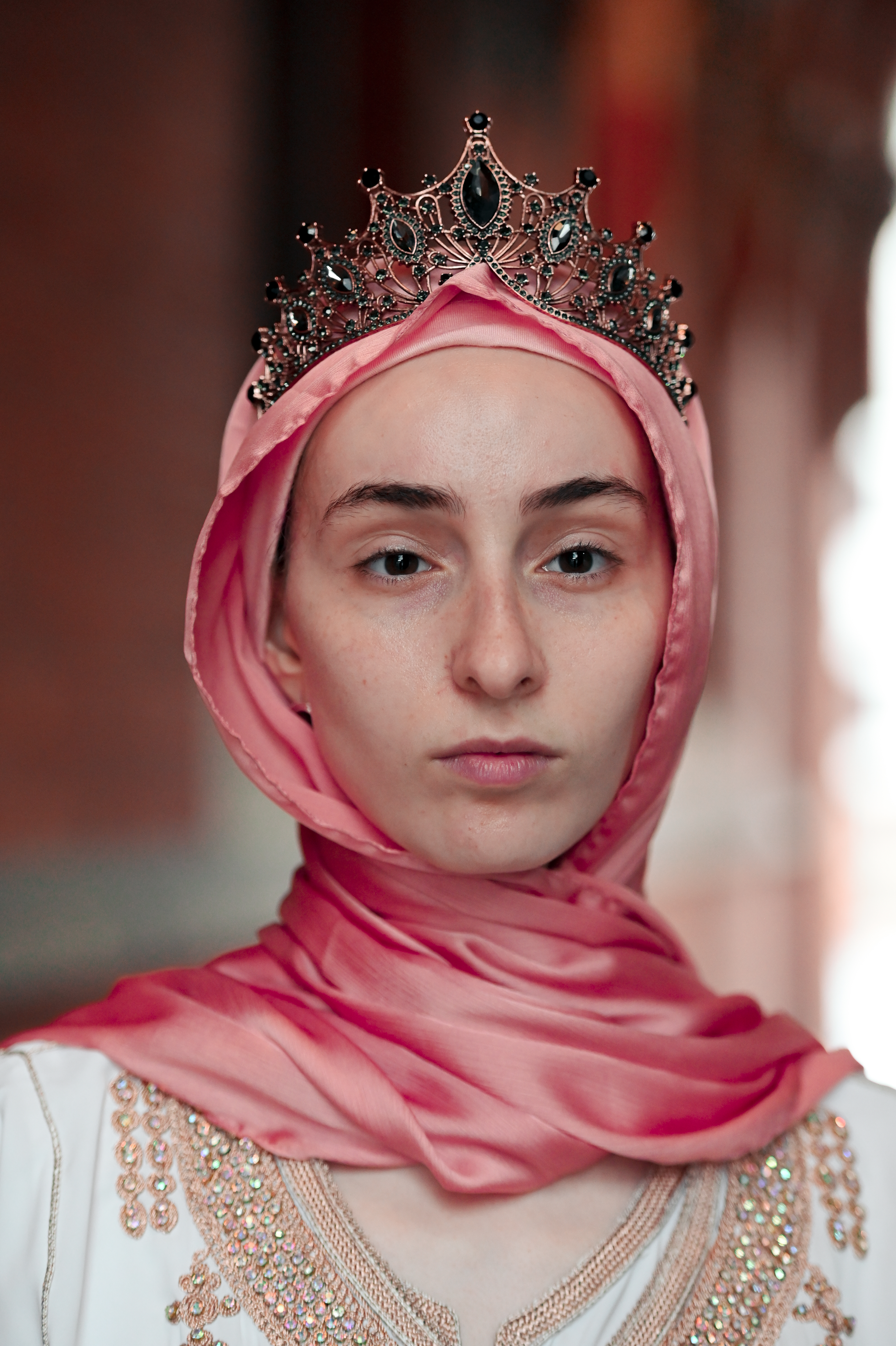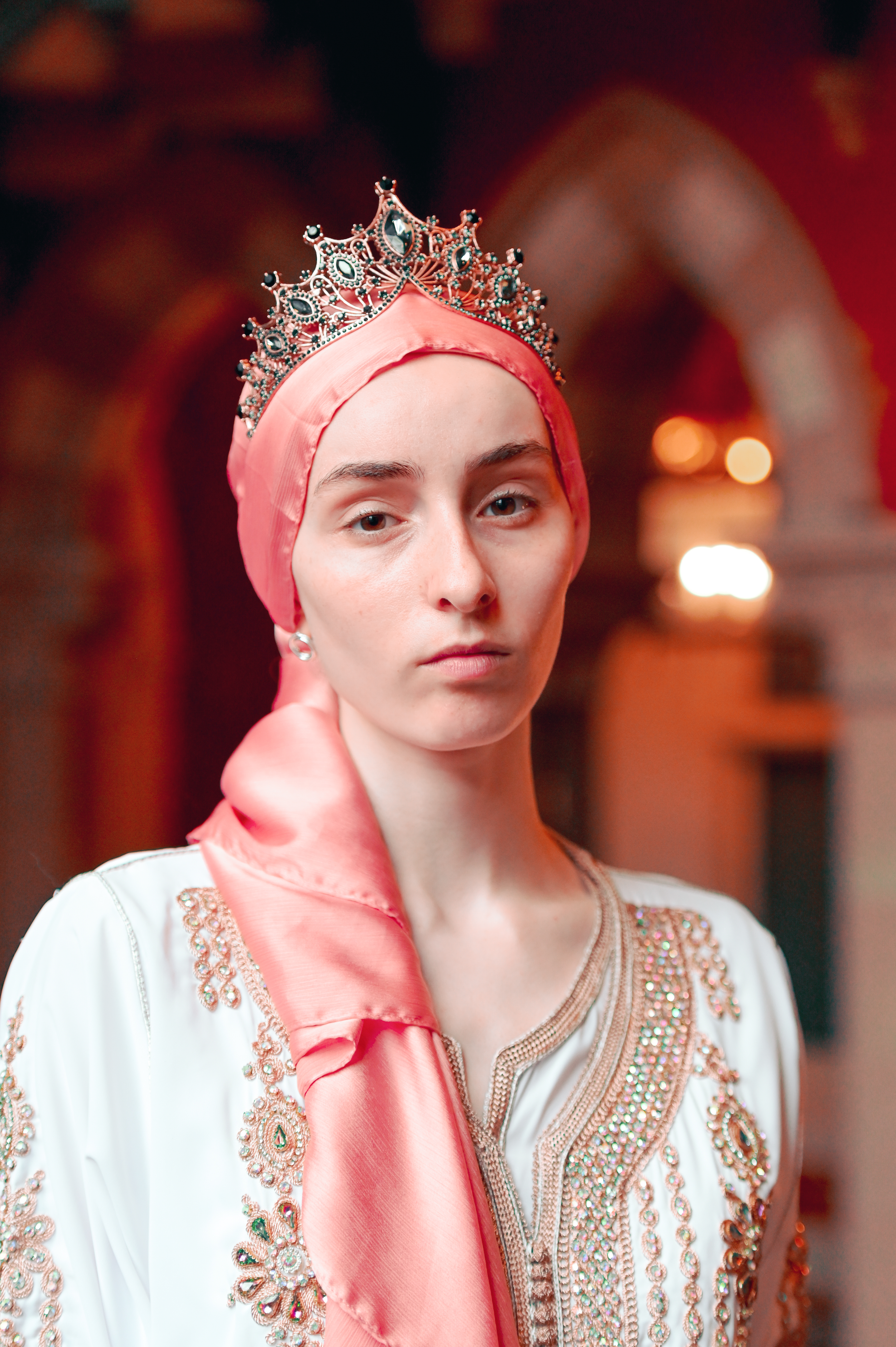 As the outfit was a bridal one, we wished to again utilise the white in the photos as a neutral colour whilst the pink hijab added a smidgen of femininity against the regal backdrop of the location. And of course, additionally, Moon’s tiara reinforced the photos emphasis towards a more royal look.
