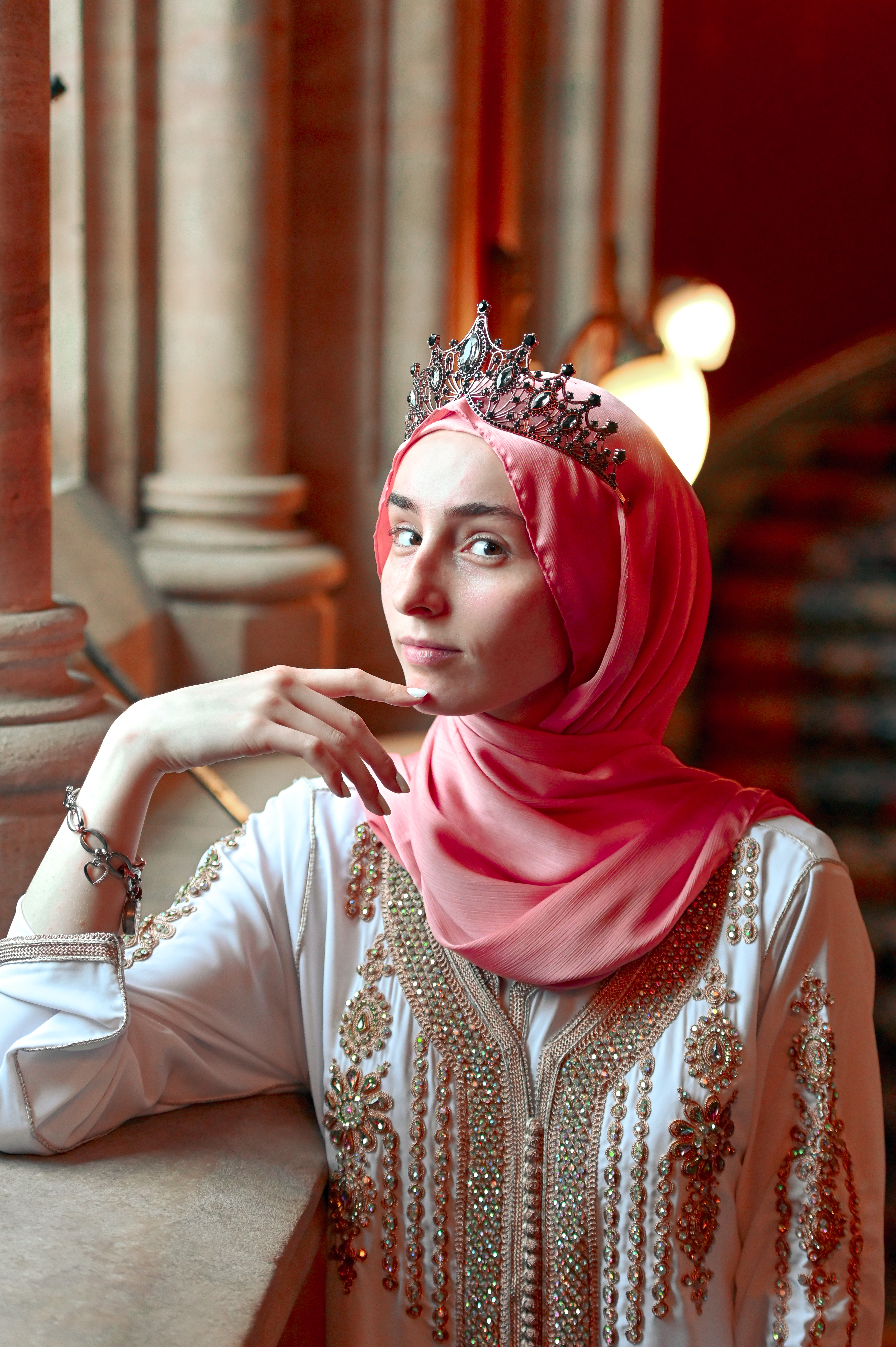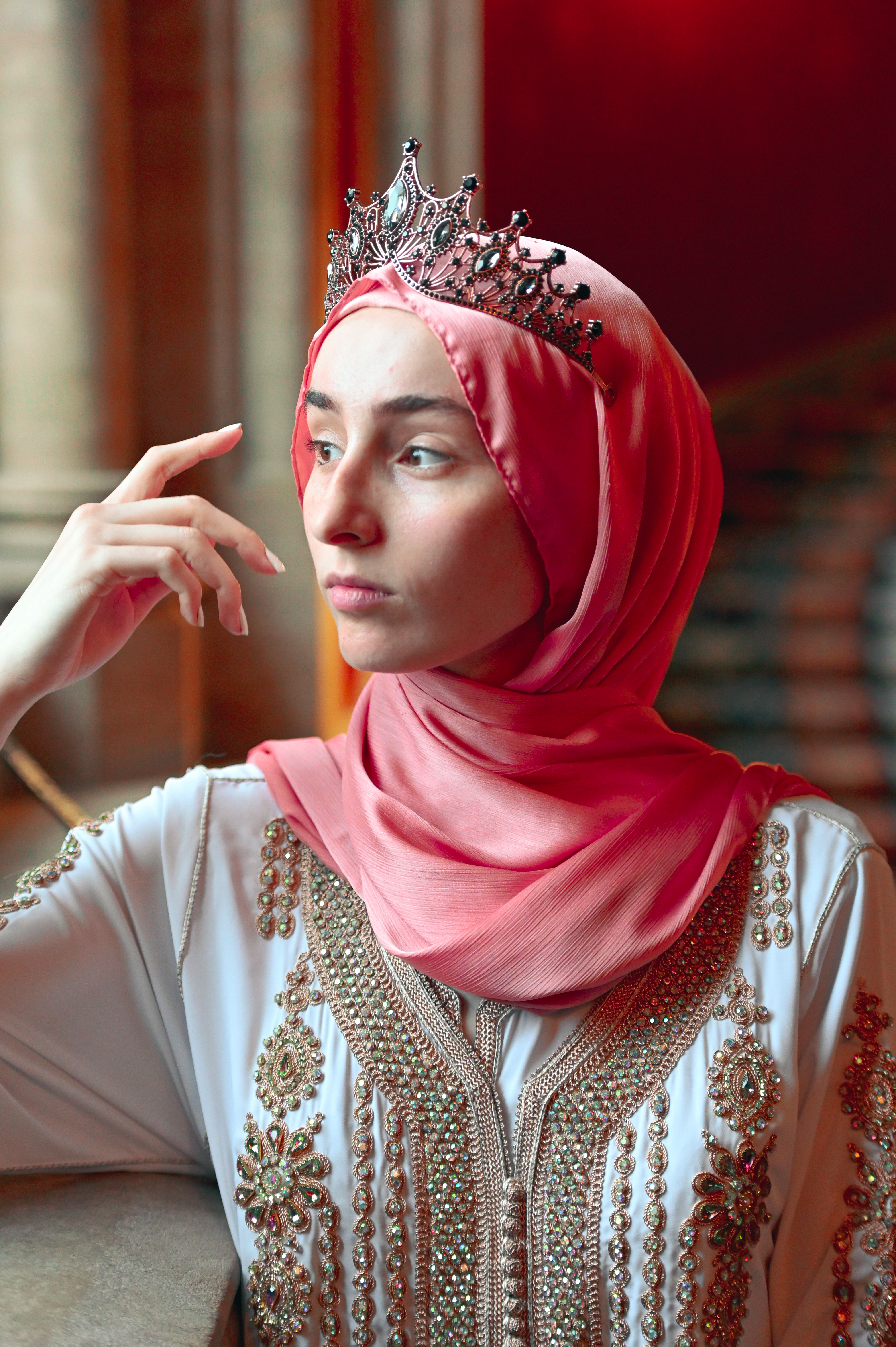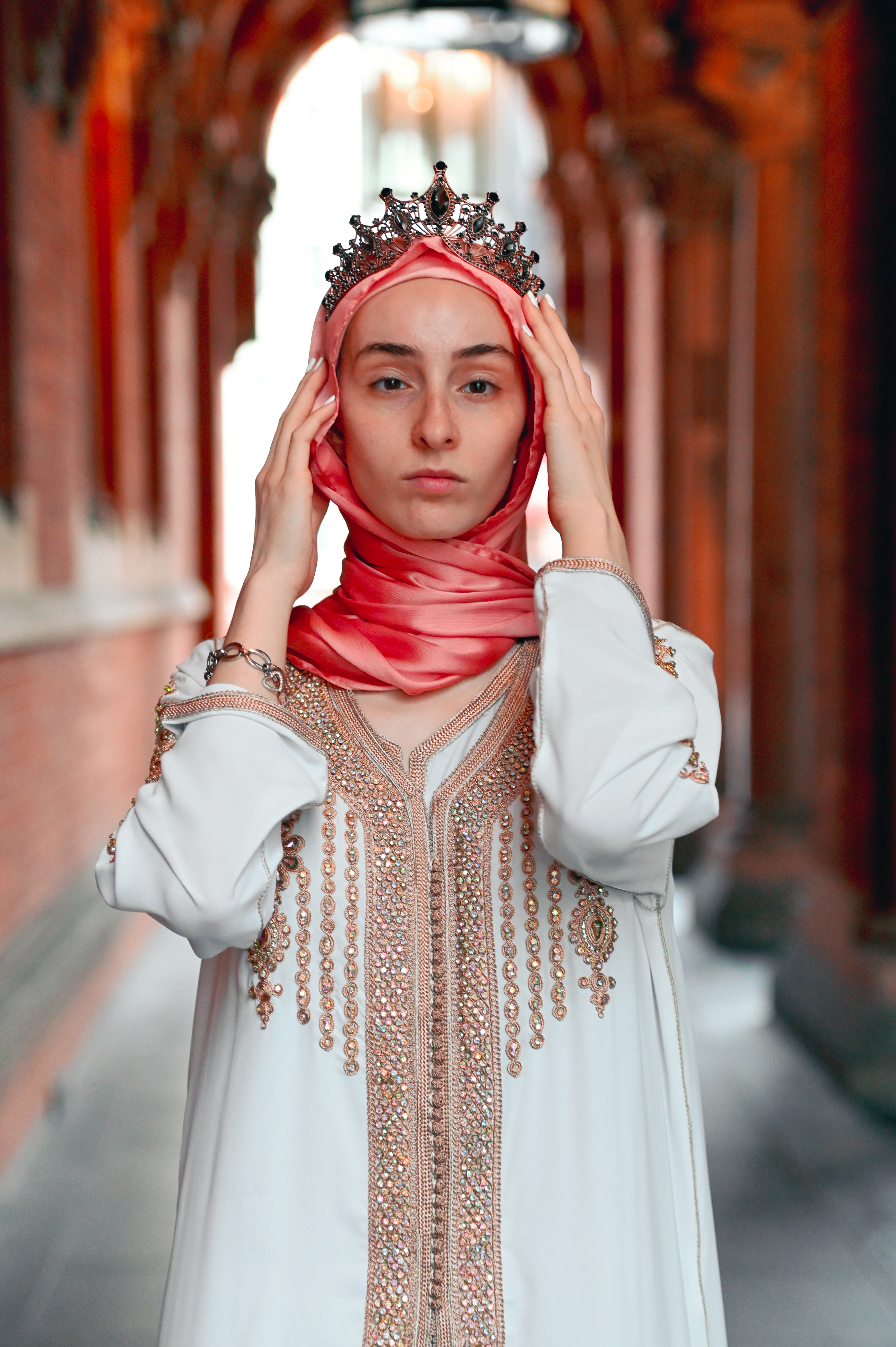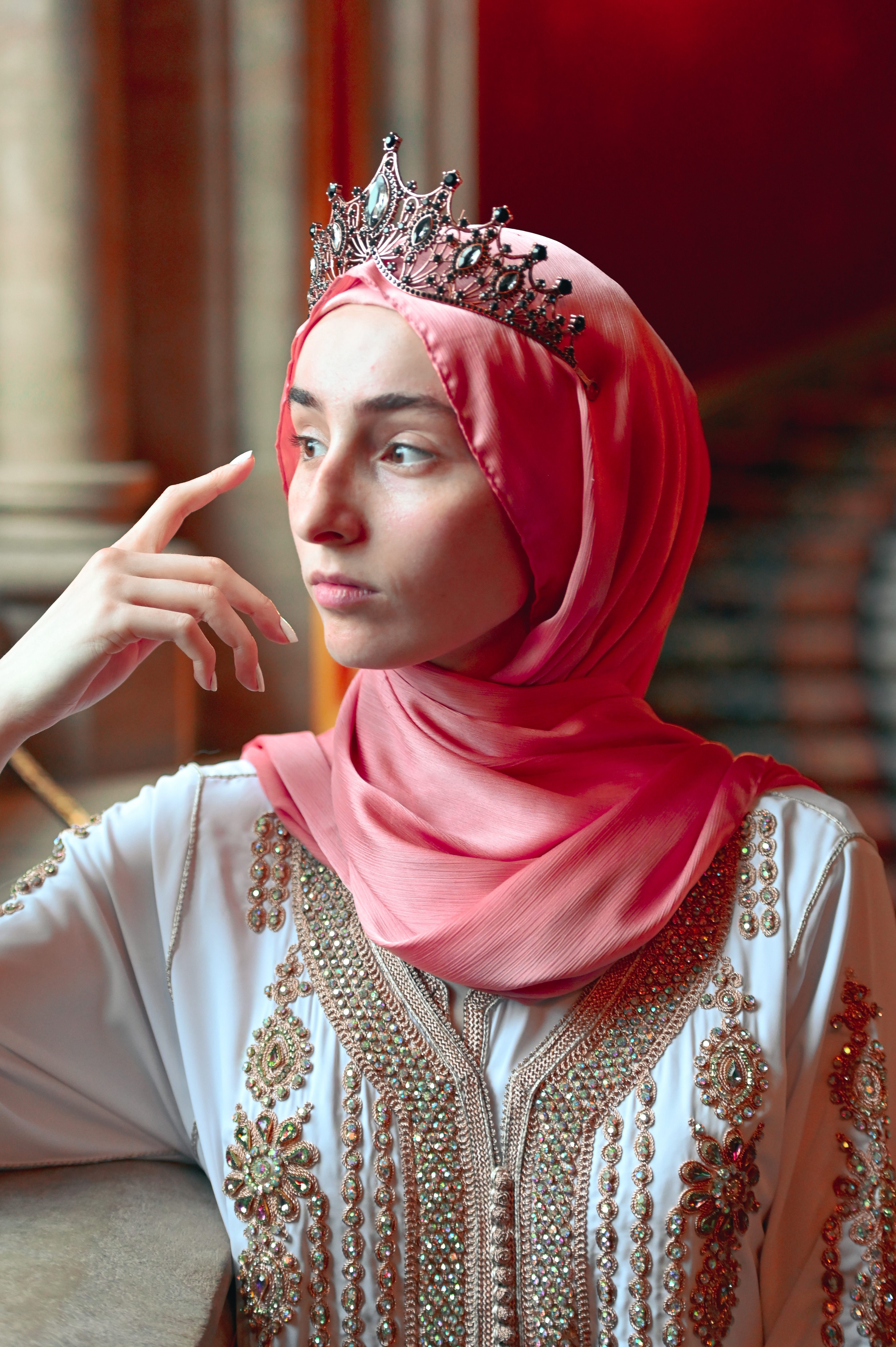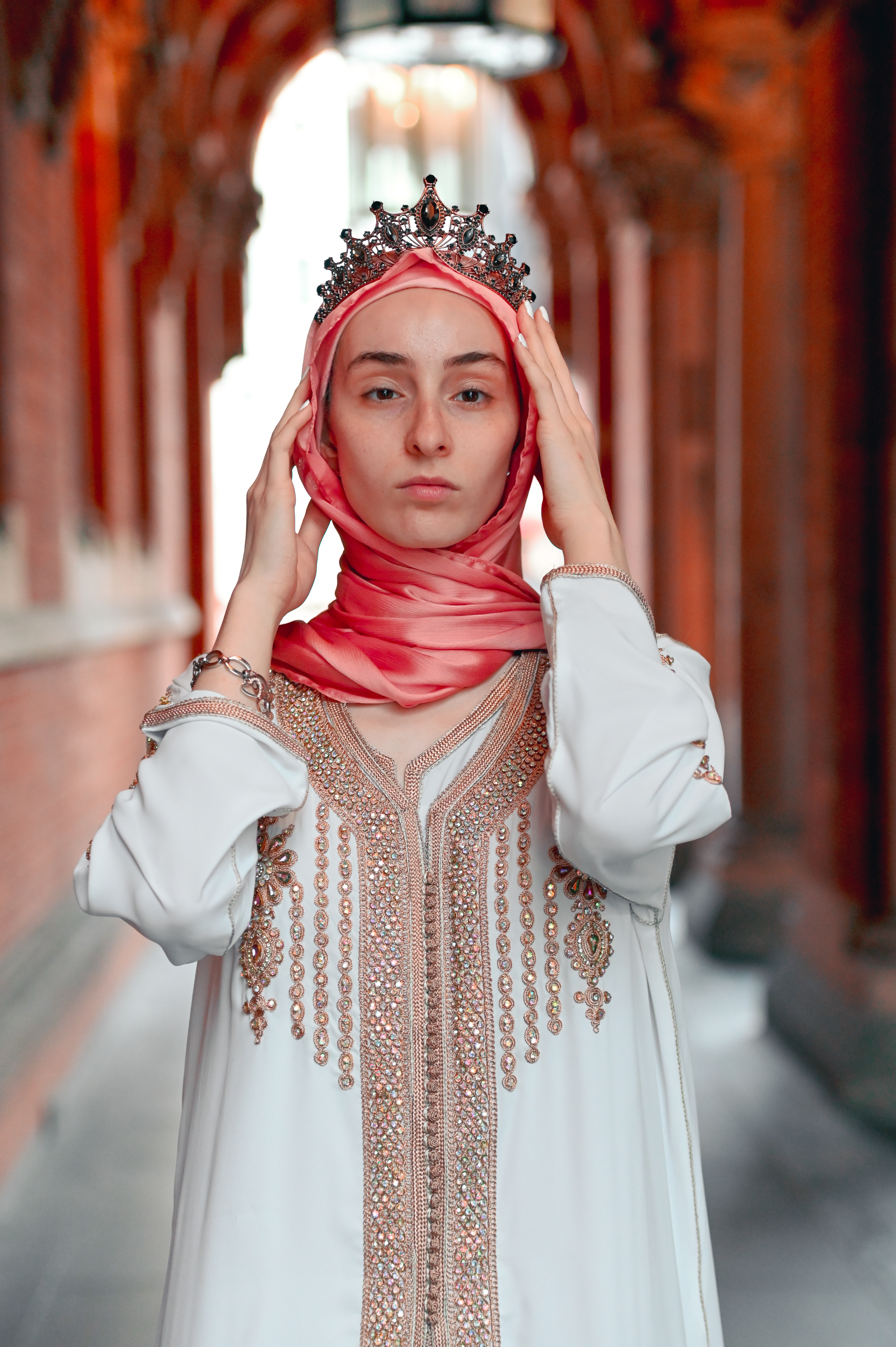 As the outfit was a bridal one, we wished to again utilise the white in the photos as a neutral colour whilst the pink hijab added a smidgen of femininity against the regal backdrop of the location. And of course, additionally, Moon’s tiara reinforced the photos emphasis towards a more royal look.