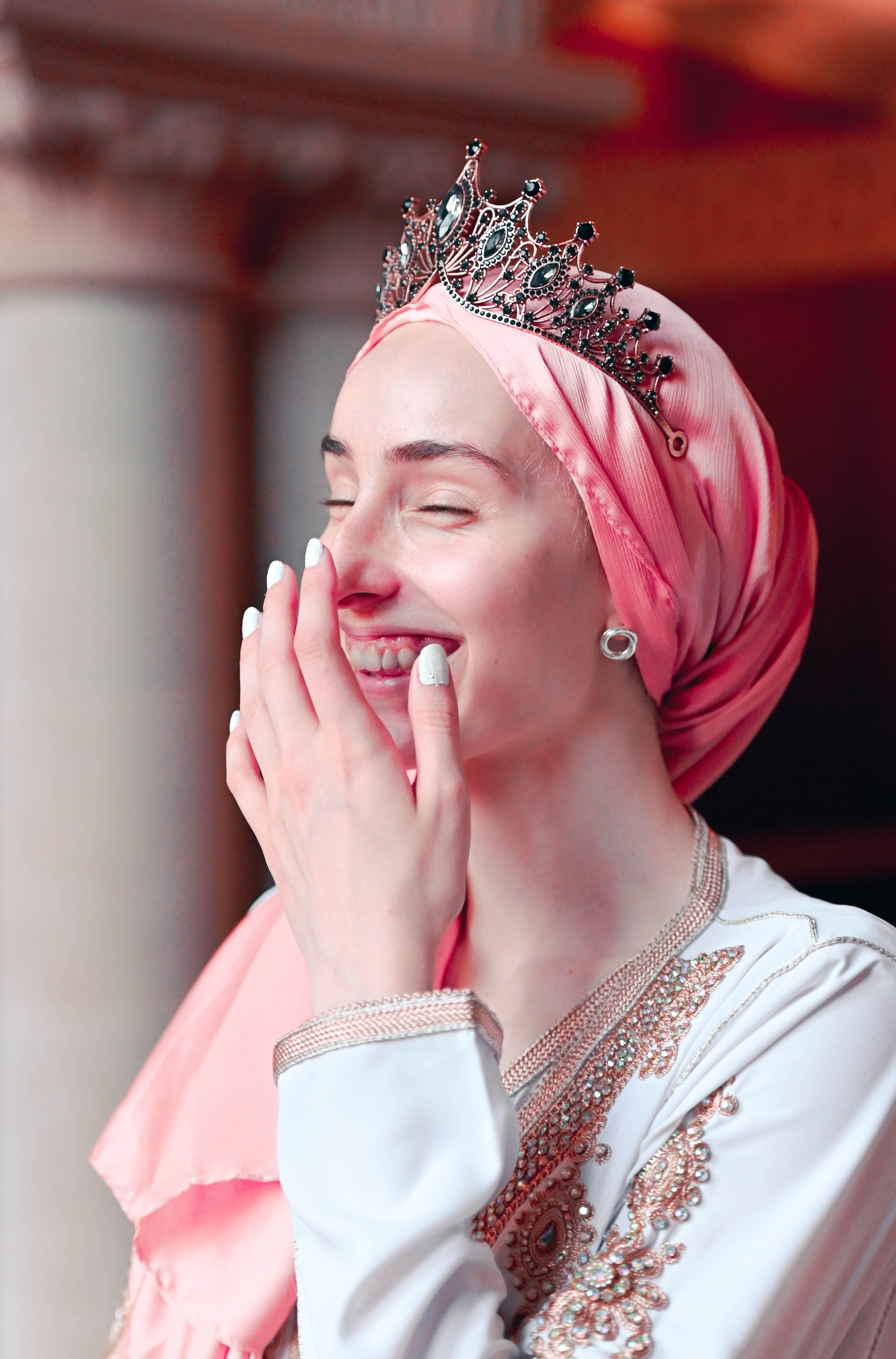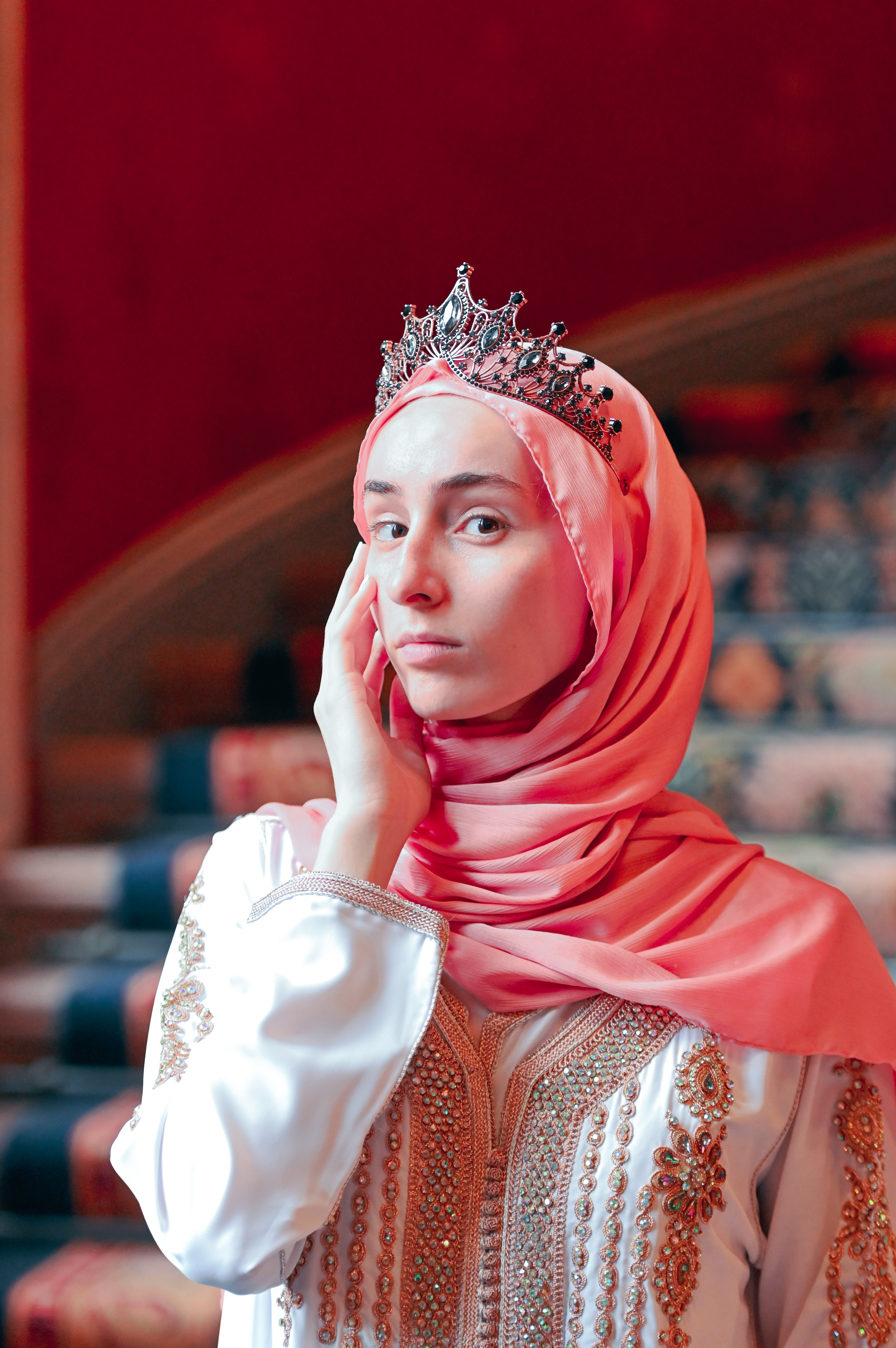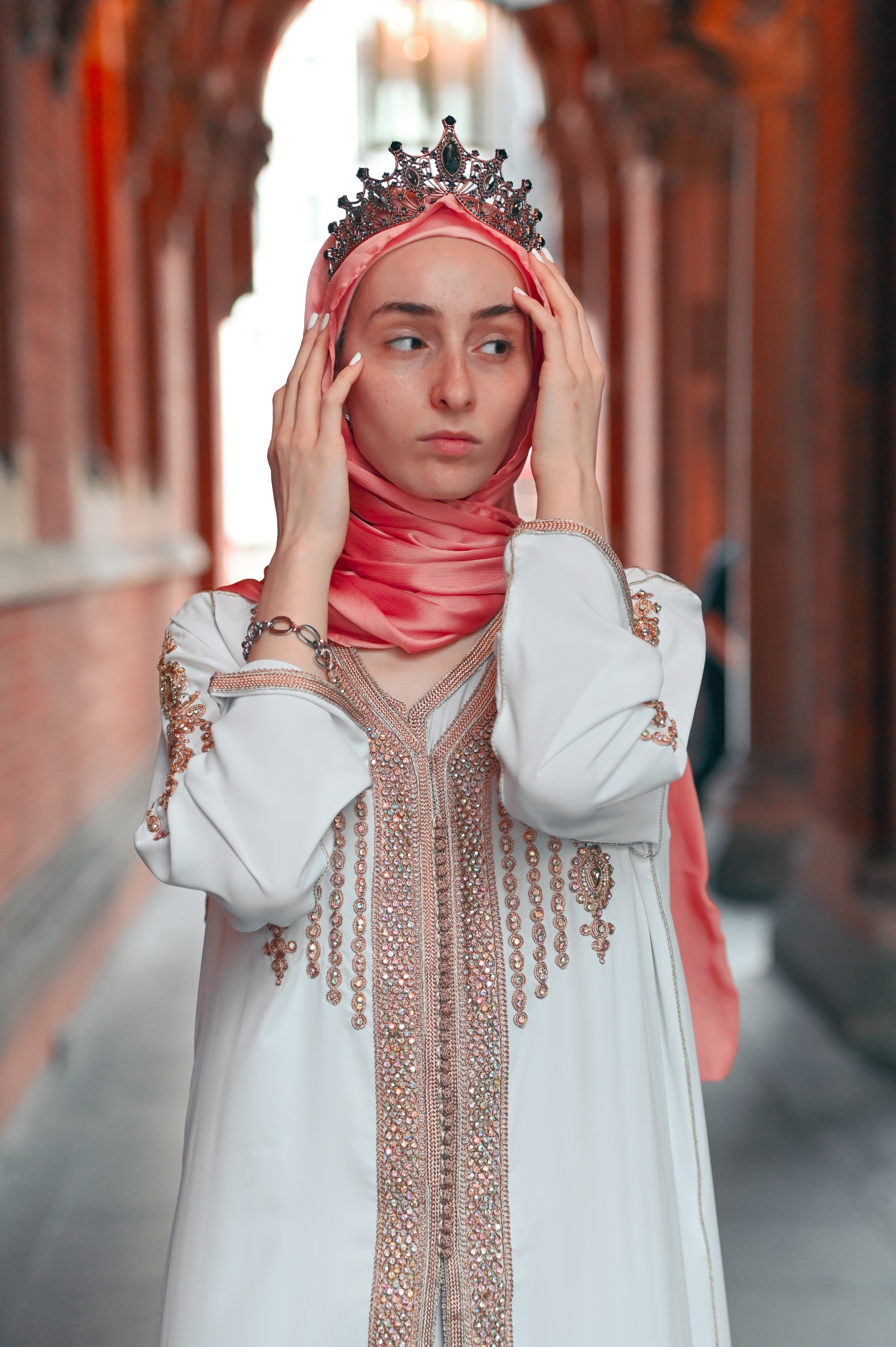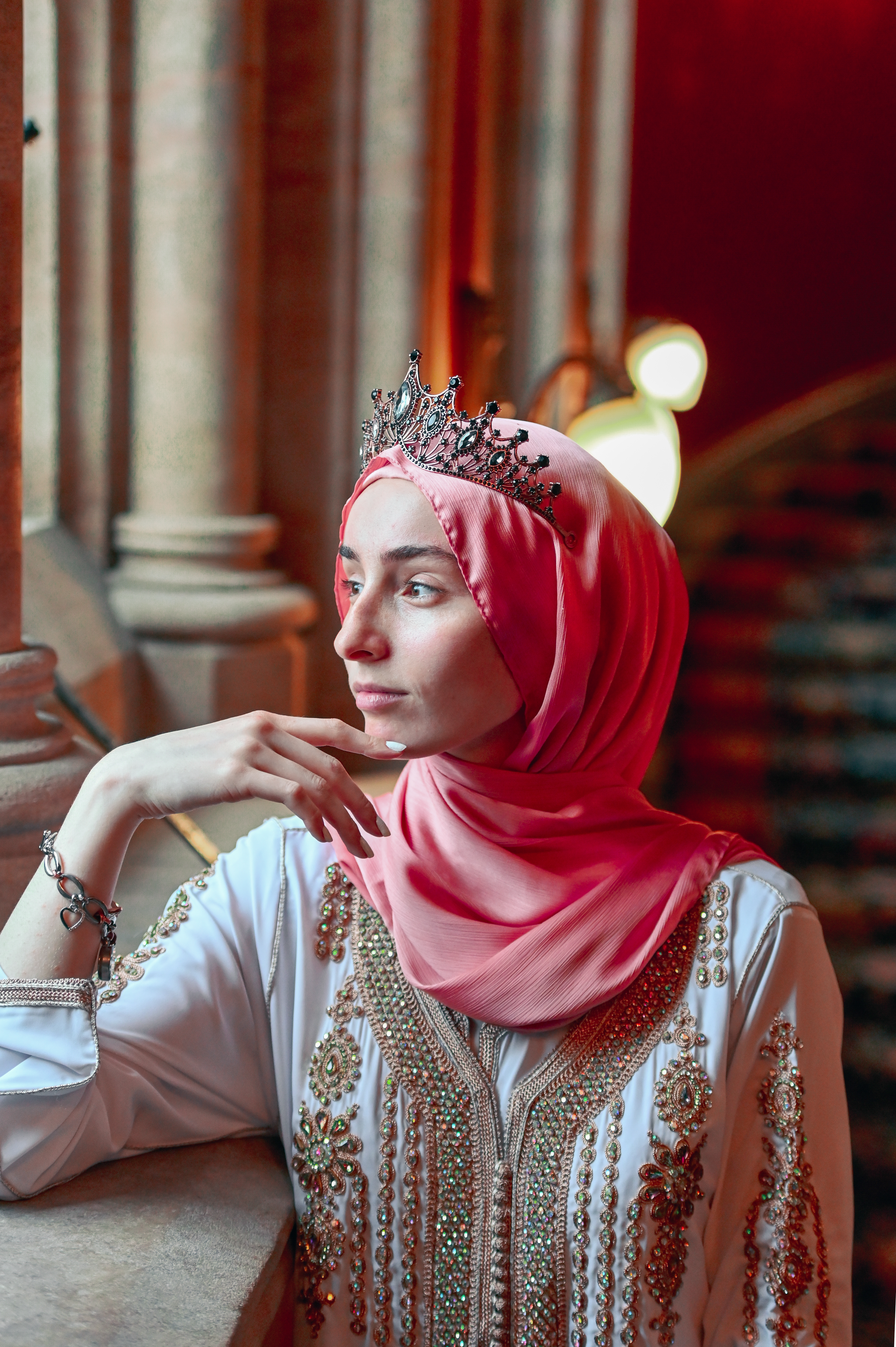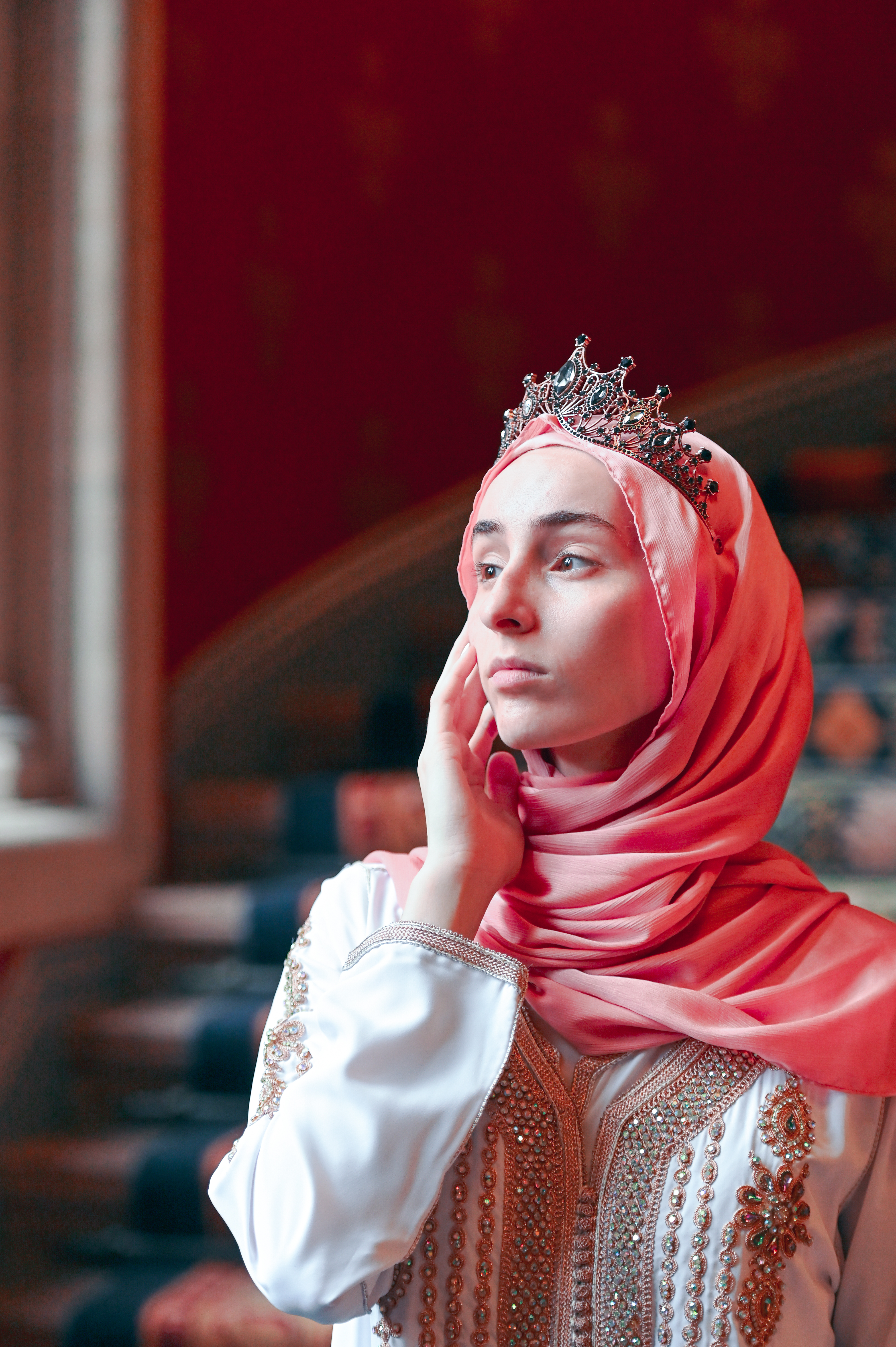 As the outfit was a bridal one, we wished to again utilise the white in the photos as a neutral colour whilst the pink hijab added a smidgen of femininity against the regal backdrop of the location. And of course, additionally, Moon’s tiara reinforced the photos emphasis towards a more royal look.